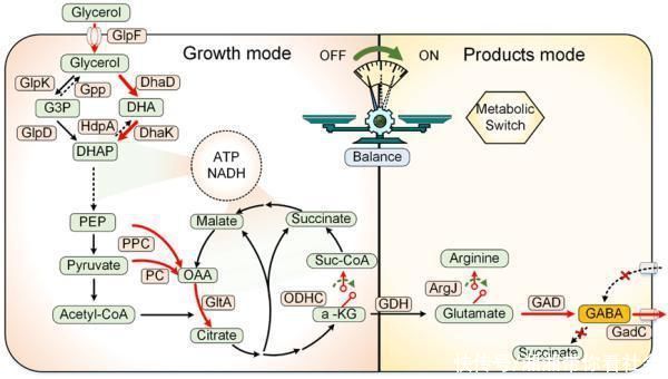 中国科学院天津工业生物技术研究所研究员刘君带领的微生物生理和代谢工程研究组以低价值甘油为原料,通过途径工程和动态代谢控制,开发了高效生产GABA谷氨酸棒杆菌细胞工厂。该研究首先利用随机RBS工程技术在谷氨酸棒杆菌中构建并优化了甘油利用途径,实现了甘油的高效同化利用。随后在该菌株中重建GABA合成途径,构建GABA合成细胞工厂,实现了甘油向GABA的生物转化。在GABA合成过程中需要TCA循环中间产物α-酮戊二酸为底物,而将过量的α-酮戊二酸代谢流导向GABA合成途径必然引起TCA循环通量降低,从而造成代谢失衡和生长阻滞,因此,如何平衡产物合成和细胞生长的关系是提升GABA生物合成的关键限制因素。该研究随后在谷氨酸棒杆菌中开发了一种可调的生长期依赖性自主双功能遗传开关(GABS),能够根据细胞生长时期自动关闭或开启基因的表达,从而实现了细胞内基因的动态表达调控。利用该调控技术重构了GABA合成代谢网络,工程菌株能够在积累足量的生物量之后发生代谢状态转变,使细胞代谢状态由“生长模式”向“生产模式”转变,从而实现了细胞生长和产物合成的协同平衡。最终构建的工程菌株GABA产量超过45 g/L,产率提升至0.4 g/g 甘油,是目前报道的利用甘油生产GABA的最高产量,对谷氨酸棒杆菌细胞工厂的代谢调控提供了新的工具和方法。