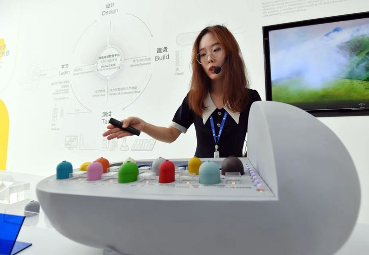 8月30日,合成生物科学馆,讲解员介绍底盘细胞模型。