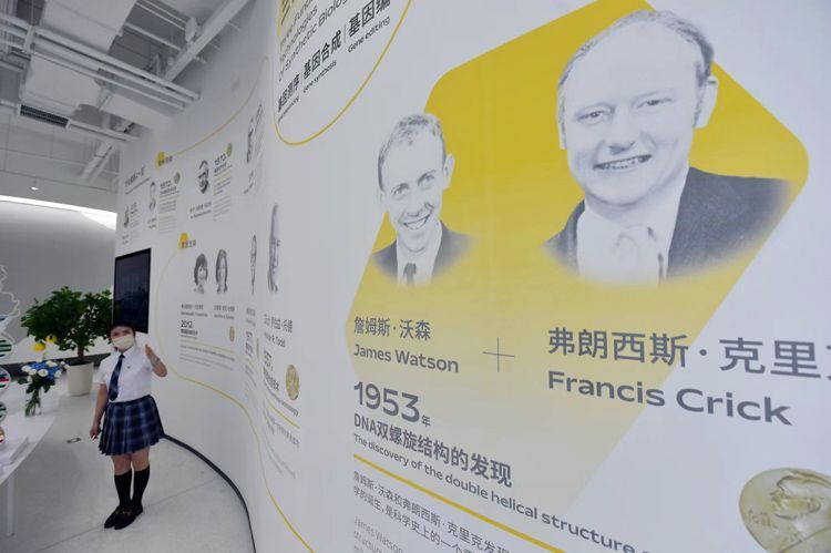 8月30日,合成生物科学馆内的科学家展示墙。观众通过参观,可以深入了解合成生物学的诞生背景、发展历程、产业化应用,以及合成生物学对双碳乃至生物经济发展的重要作用。(李木易 耿子叶)
