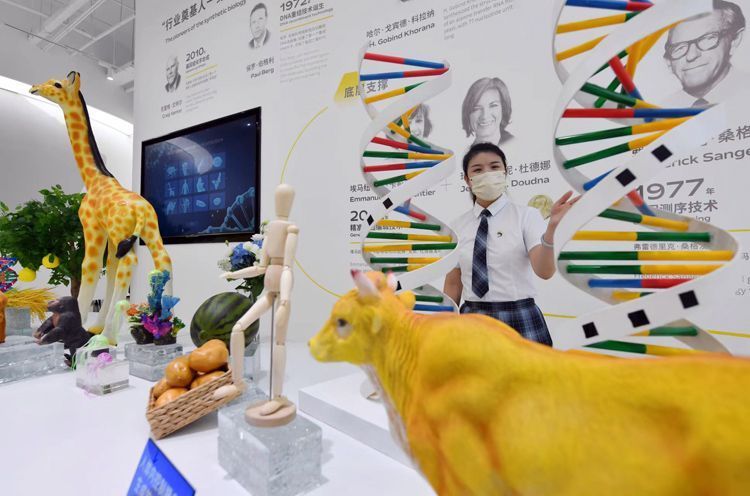 8月30日,合成生物科学馆,讲解员介绍DNA的双螺旋结构展品。馆内通过多样化的展示方式,讲述了合成生物的技术起源、发展沿革、应用场景等内容,展现生物科技对人类生命及未来发展所带来的冲击与变革。